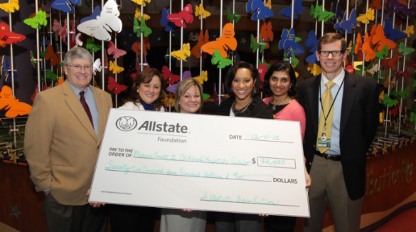The Allstate Foundation presented a check for $72,400 to the Monroe Carell Jr. Children’s Hospital at Vanderbilt Tuesday to support “Be in the Zone,” the hospital’s teen motor vehicle safety program. On hand were, from left, Vanderbilt’s Luke Gregory and Barbara Schultz, Allstate’s Vivan Mink and Allison Hatcher, and Vanderbilt’s Purnima Unni, MPH, and Steve Morrow, M.D.