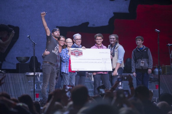 Country music singer Dierks Bentley held his 10th annual “Miles and Music for Kids” benefit for Monroe Carell Jr. Children’s Hospital at Vanderbilt Sunday at Ascend Amphitheater. Department of Pediatrics Chair Steven Webber, MBChB, MRCP, and Vanderbilt patient Dalton Waggoner were invited to the stage for this year’s check presentation of $636,479, which will go to support the “Growing to New Heights” campaign for the expansion of Children’s Hospital. Over the past decade, the motorcycle ride and concert event has raised more than $3 million for Children’s Miracle Network hospitals. Pictured, from left, are Bentley, mother Susan Waggoner, patient Dalton Waggoner, Webber, brother Daniel Waggoner and friends Meredith Chaffin and Presley Gilbert.