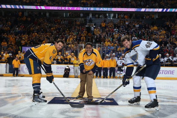 Cesar Espinosa, center, served as patient ambassador for Monroe Carell Jr. Children’s Hospital at Vanderbilt at the recent Nashville Predators Hockey Fights Cancer Night. Here, Espinosa drops the puck with the Predators’ Shea Weber, left, and the St. Louis Blues’ David Backes. Over the past six years, the Predators team has raised and donated more than $1 million to the Children’s Hospital and its programs.