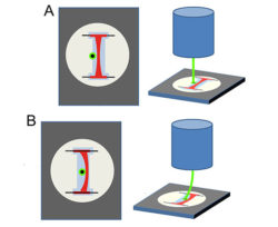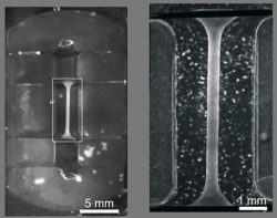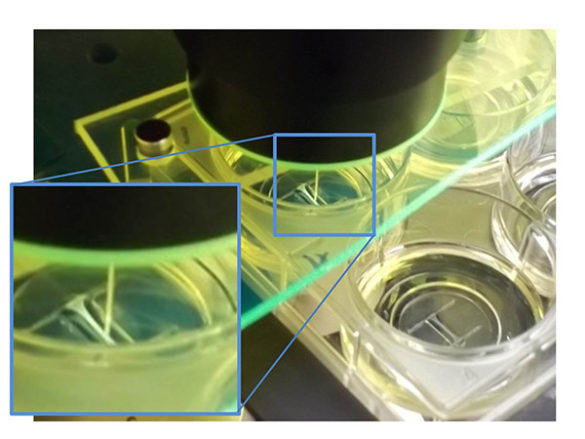 The fiber is supported by wires and a frame in an optically clear well that is filled with liquid medium like that which surrounds cardiac cells in the body. The apparatus is mounted on the stage of a powerful optical microscope that records the fiber’s physical changes. The microscope also acts as a spectroscope that can provide information about the chemical changes taking place in the fiber. A floating microelectrode also measures the cells’ electrical activity.