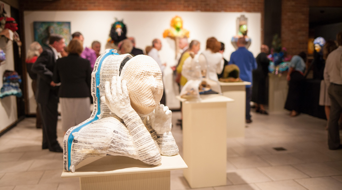 Radiation masks donated by head and neck cancer patients and decorated by Nashville-area artists were displayed during the recent Courage Unmasked event at Vanderbilt’s Sarratt Gallery.