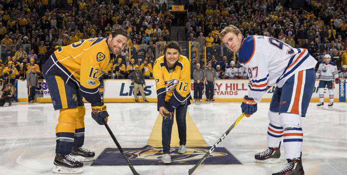 Cesar Espinosa, center, served as patient ambassador for Monroe Carell Jr. Children’s Hospital at Vanderbilt at the recent Nashville Predators Hockey Fights Cancer Night. Here, Espinosa drops the puck with the Predators’ Shea Weber, left, and the St. Louis Blues’ David Backes. Over the past six years, the Predators team has raised and donated more than $1 million to the Children’s Hospital and its programs.