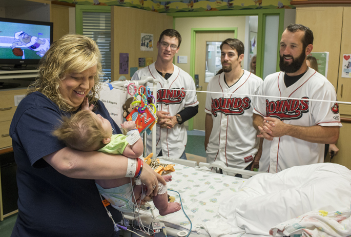 Members of Nashville Soccer Club visited with patients and families at Monroe Carell Jr. Children’s Hospital this week. The United Soccer League club made its debut earlier this year and regularly draws thousands to its games at First Tennessee Park. Here, patient Cullen Barnhouse, 10, talks with Nashville SC players, from left, Ian McGrath, Bolu Akinyode, Bradley Bourgeois and Matt Pickens.