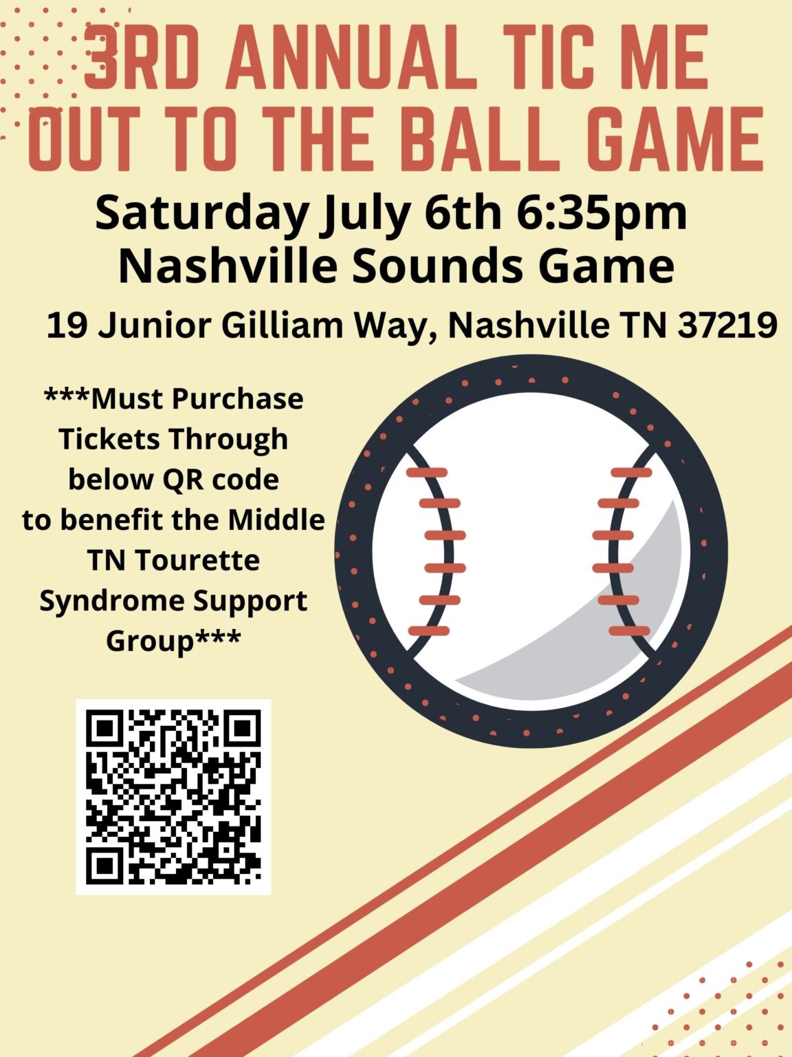 Vanderbilt University Medical Center’s Tourette Syndrome Center of Excellence is collaborating with the Middle Tennessee Tourette Support Group to raise funds for the support group. On Saturday, July 22, 6:35pm, at First Horizon Park in downtown Nashville, the city’s minor league baseball team, the Nashville Sounds (triple-A), will play the Jacksonville Jumbo Shrimp. For each ticket sold through the QR code displayed below or through this link to the Sounds tickets website, the team will donate $5 to the support group. For more information on the Middle Tennessee Tourette Support Group, contact them by email at midtntourette@gmail.com.