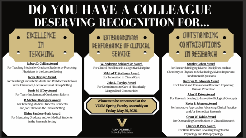 The annual Awards for Excellence in Teaching, Extraordinary Performance of Clinical Service, and Outstanding Contributions to Research are proud Vanderbilt traditions