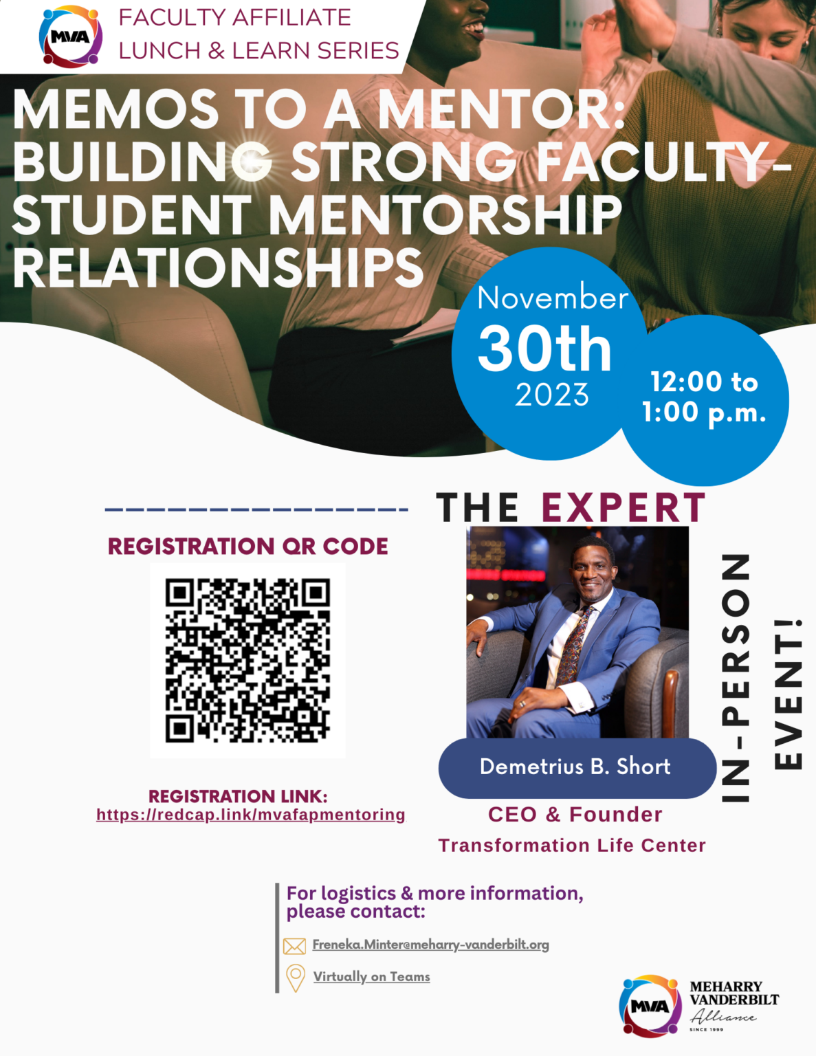 November 14, 2023 Meharry-Vanderbilt Alliance Lunch and Learn series presents “Memos to a Mentor,” Nov. 30 By VUMC News and Communications