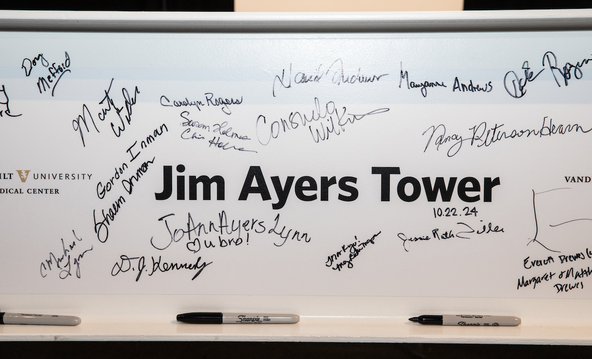 “Jim and I hold Nashville and all of Tennessee close to our hearts,” said Janet Ayers, who spent her career in health care administration. “The Jim Ayers Tower reflects the principles we share with VUMC of serving others and ensuring the best quality of life, including for those who may otherwise be underserved. We are so touched to see Jim recognized in such a meaningful way.”