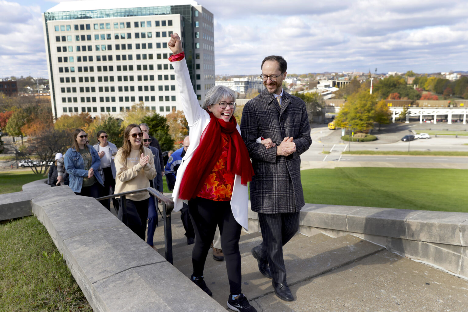 Betsy Williams is escorted up the steps of the Tennessee State Capitol by Metro Nashville mayor Freddie O'Connell and a large group of well-wishers. (photo by Donn Jones)