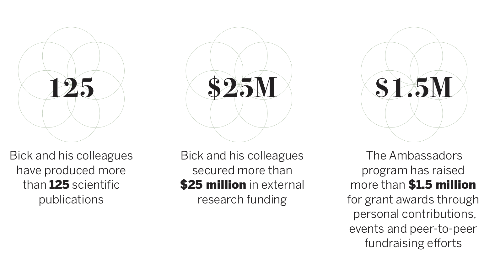 Bick and his colleagues have since produced more than 125 scientific publications and secured more than $25 million in external research funding to further unwind the genetic drivers of blood and other cancers and diseases. And his Ambassador Grant, like many others, has resulted in extending tendrils of research innovation to the laboratories of investigators throughout the world. Which means the program is doing exactly what it is intended to do.