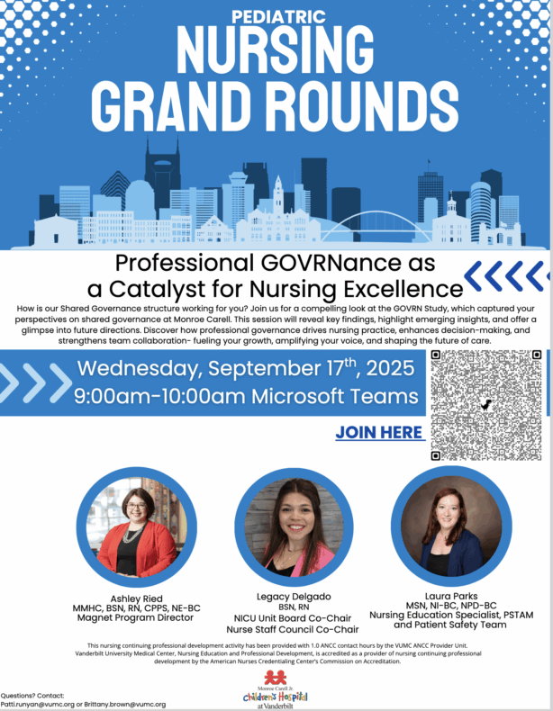 August 26, 2025 Pediatric Nursing Grand Rounds, ‘Professional Governance as Catalyst for Nursing Excellence,’ is Sept. 17