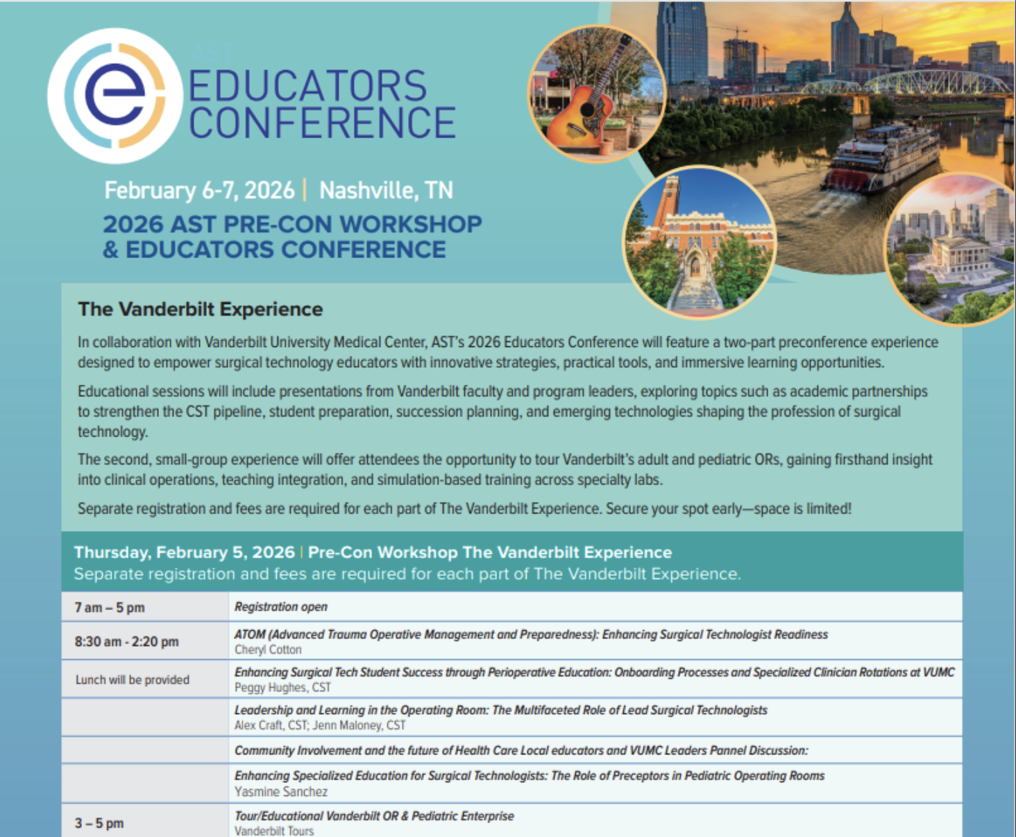 The Association of Surgical Technologists Educators Conference will be held in Nashville on Feb. 6-7, and a pre-conference workshop, titled “The Vanderbilt Experience,” will be held Feb. 5.