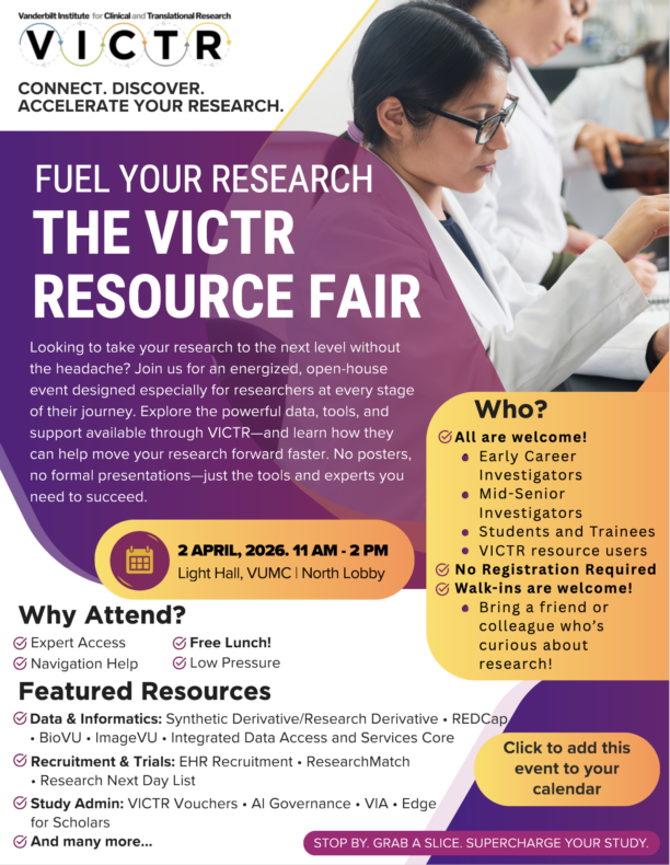 The Vanderbit Institute for Clinical and Translational Research (VICTR) is hosting a Resource Fair, Thursday, April 2, from 11 a.m. to 2 p.m. This event is an opportunity to connect, explore valuable resources, and discover tools to enhance your research. The event will take place in the North Lobby of Light Hall and is open to all VICTR data resource users, graduate students and medical students.