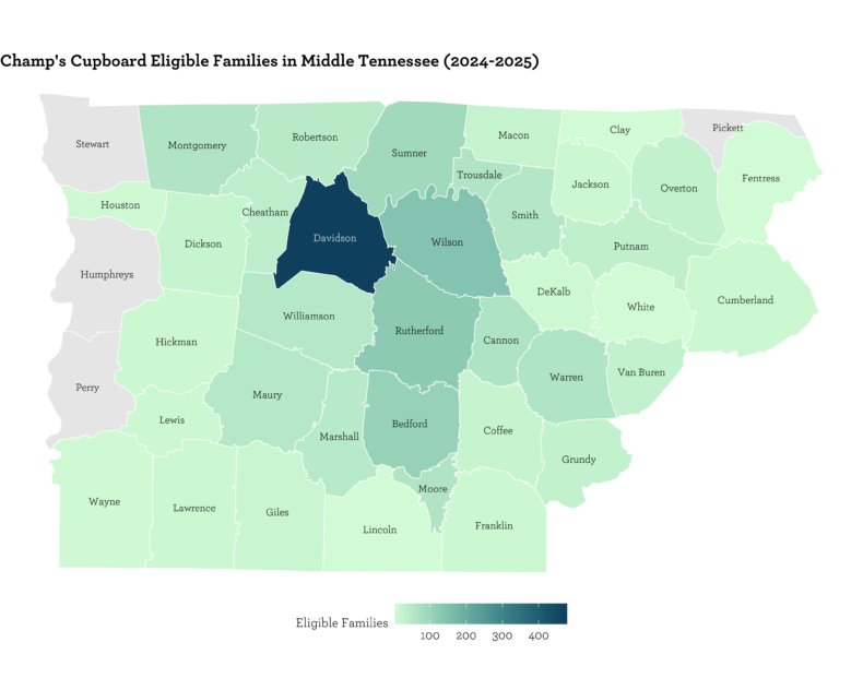 Launched just over a year ago, Champ’s Cupboard is a hospital-based nutrition resource program supporting families experiencing food access challenges. The program has already made a meaningful impact on families at Monroe Carell Jr. Children’s Hospital at Vanderbilt. In the program’s first year, the team distributed a frozen meal or box of nonperishable food items to 235 families in the hospital, with 98% of recipients saying the food was helpful.