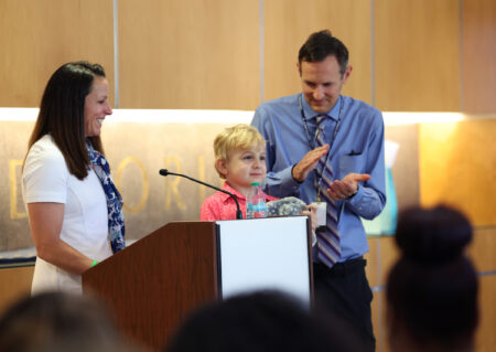 Margaret Drewes attended the ceremony with her husband Matthew and son Everett and shared her family’s story. Everett was born with a rare condition called Eagle-Barrett Syndrome, in which underdeveloped abdominal muscles and abnormalities in the urinary tract system led to kidney problems. She knew even before her son was born that he would likely need a kidney transplant as a child.