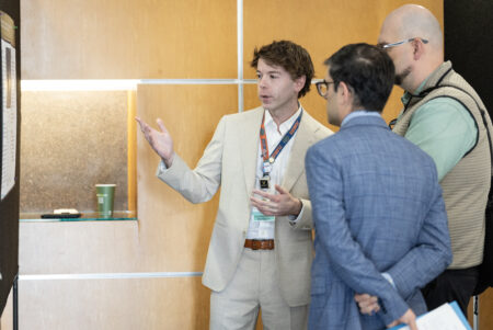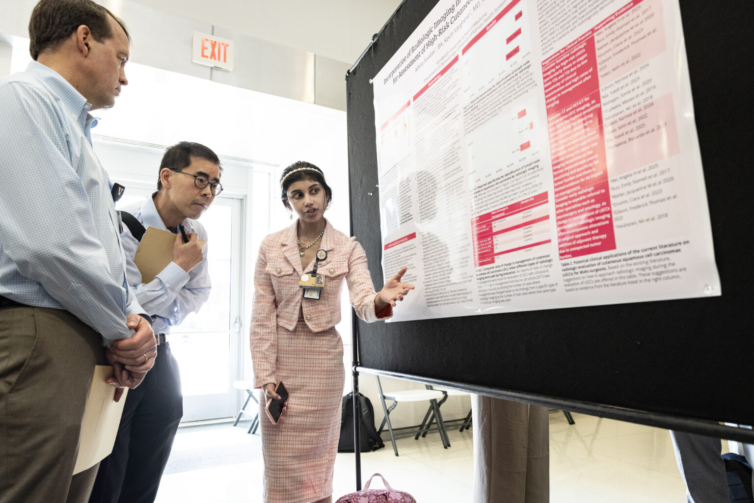 Peter Reese, MD, PhD, and Marcus Tan, MBBS, listen to Vanderbilt medical student Athira Sivadas, as she explains her research on incorporating radiologic imaging in Mohs micrographic surgery for assessment of high-risk cutaneous squamous cell carcinoma. (photo by Erin O. Smith)