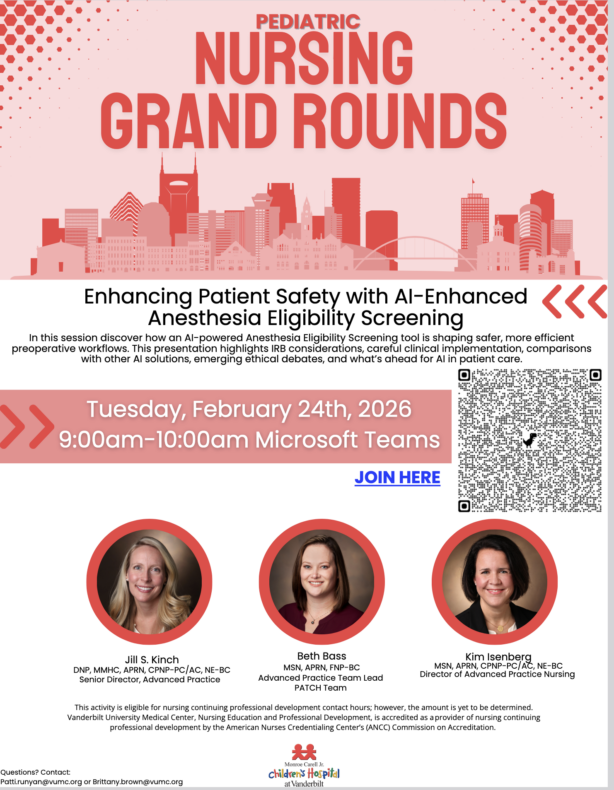 Pediatric Nursing Grand Rounds, ‘Enhancing Patient Safety with AI-Enhanced Anesthesia Eligibility Screening,’ is Feb. 24