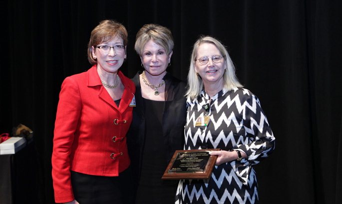 Marilyn Dubree, MSN, R.N., executive chief nursing officer, left, and Colleen Conway-Welch, Ph.D., CNM, dean of the School of Nursing, center, with Margie Gale, MSN, R.N., Employee Assistance Program nurse wellness specialist, who received of the Rebecca Clark Culpepper Education and Mentorship Award during the 2013 Nurses Week Awards and Recognition Ceremony last week in Langford Auditorium. Individual nurses, teams and supporters of nursing were acknowledged for their ongoing dedication to patients and families.