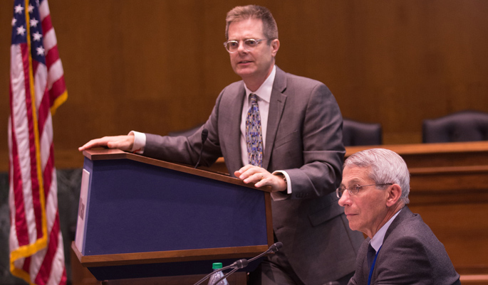 James Crowe Jr., M.D., director of the Vanderbilt Vaccine Center, and Anthony Fauci, M.D., director of the National Institute of Allergy and Infectious Diseases (NIAID), recently participated in a U.S. Senate National Institutes of Health (NIH) caucus briefing held in Washington, D.C., by Senate NIH caucus co-chairs Sens. Lindsey Graham (R-SC) and Dick Durbin (D-IL).